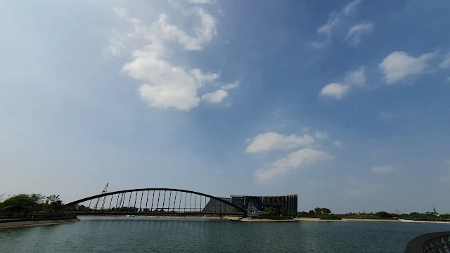 從南大門進入後,徒步來到故宮南院的「至美橋」,橋的結構形式與造型採用書法中的草書,以韻律的動態氣勢引導入館的民眾進入到本館所在的位置,且走在橋上,可以一覽下方的「至善湖」,且橋身的蜿蜒設計更象徵有龍的意象,當站在橋上欣賞左右兩側的景致時更有不同的視覺享受。